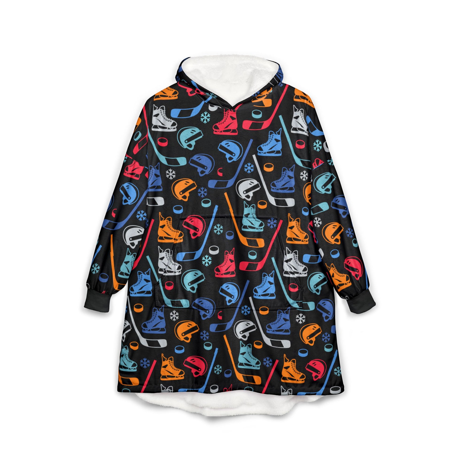 Slide into something that feels like a warm rink-side hug. This hooded blanket wraps you in soft fleece printed with a playful, vintage-inspired hockey pattern—colorful helmets, skates and sticks skimming across an icy blue field. The oversized kangaroo pocket keeps your hands toasty and stashes snacks or a phone while you settle in for a game night or a chilly evening on the couch. Lightweight but warm, the medium-weight fabric drapes easily for lounging, travel, or layering over pajamas. The print stays bright through washes, and the sewn-in label keeps the interior smooth against your skin. Wear it after practice, beside the fire, or on a weekend stream-a-thon—this blanket feels like community and cold-weather memories stitched into one cozy piece.